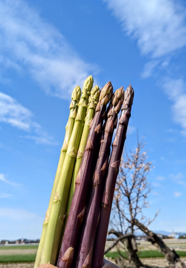 グリーンアスパラと紫アスパラの食べ比べをお楽しみください! 紫アスパラはグリーンよりも柔らかく甘みが強い品種です。グリーンを食べたいけど、紫にもちょっと興味があるという方は是非この機会にお試しください! ちなみに紫アスパラは加熱するとグリーンに変わりますので、その様相もお楽しみ頂けると幸いです。