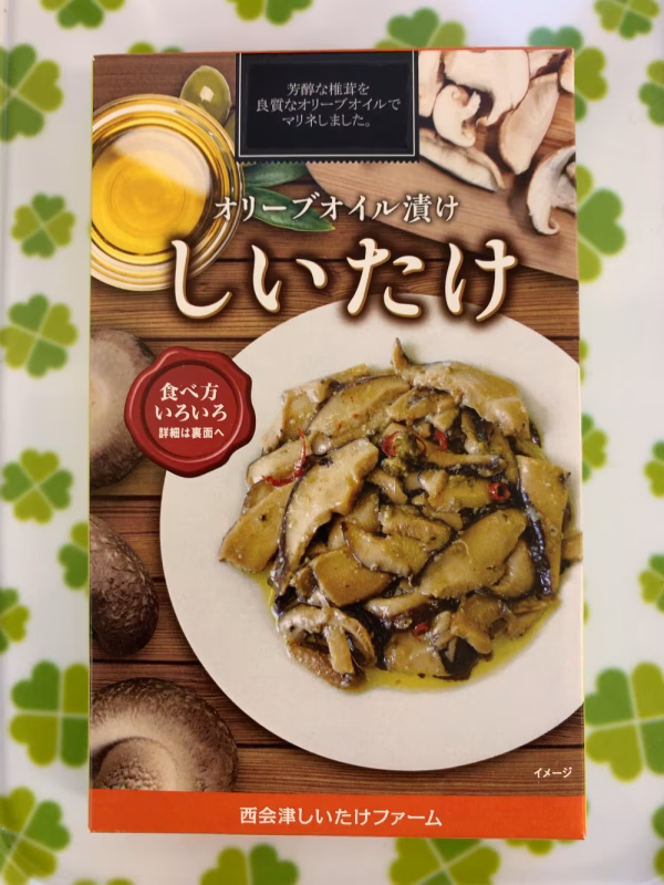 - 名称:椎茸のオイル漬け 原材料:椎茸、オリーブオイル、にんにく、ケーパース酢漬、バジル、食塩、ブラックペッパー、赤唐辛子、ローリエ 内容量:90g(固形量80g) 保存方法:直射日光、高温多湿を避け常温保存 販売者:西会津しいたけファーム 福島県耶麻郡西会津町新郷大字豊洲字堀端6561 TEL:0467-40-4177 製造者:奥川こらんしょ村 福島県耶麻郡西会津町奥川大字飯里字沢ノ目449-6 TEL:080-1695-3405 栄養成分表示(100gあたり) エネルギー:312kcal タンパク質:3.8g 脂質:25.0g 炭水化物:20.3 食塩相当量:0.41g