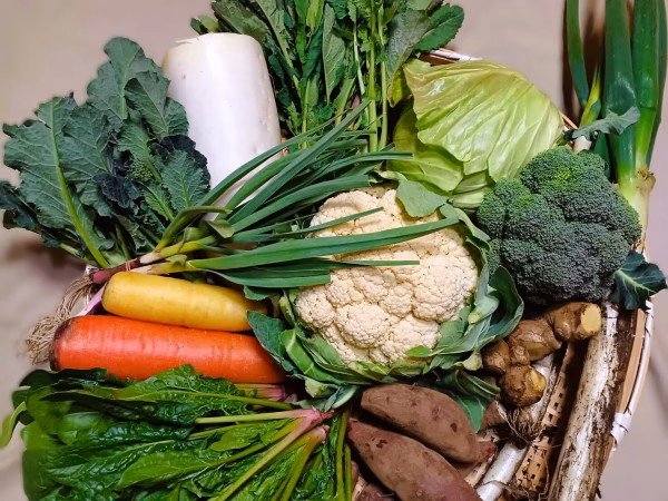 ▼商品概要 露地栽培中心の、冬の旬な野菜セットをお届けします。 味が濃く、栄養満点な安心・安全な野菜たちを是非ご賞味ください。 ▼品種・味の特徴 大根、にんじん、ネギ、ブロッコリー、ほうれん草、さつまいも、しょうが、キャベツ、アレッタブロッコリー、カリフラワー、のらぼう菜、葉ニンニク その他 一番のおすすめ野菜を、7~8種類セットにしてお届けいたします。上記野菜が中心となりますが、野菜の状況にもよりますので変更する場合があります。どんな野菜が届くのか楽しみにしてください! ▼栽培/生産方法、こだわり ・殺虫剤・殺菌剤、除草剤は使用せず、野菜にとって常により良い環境を整備 ・化成肥料・動物性肥料は使用せず、「木のチップ」「籾殻」「雑草」などのオリジナル堆肥を使用 ・普段使い~変わり種を少量多品種の詰め合わせをご自宅まで! ▼注文に際しての注意点(配送方法や納期指定など) 毎週金曜日の発送となります。前週木曜日から水曜日までにご注文いただいた分を金曜日に発送いたします。ご注文いただいてから収穫し発送いたしますのてご了承願います。