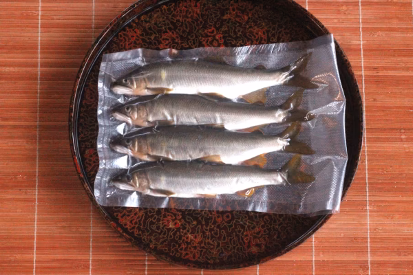 釣った鮎は氷締めし、真空冷凍しました。