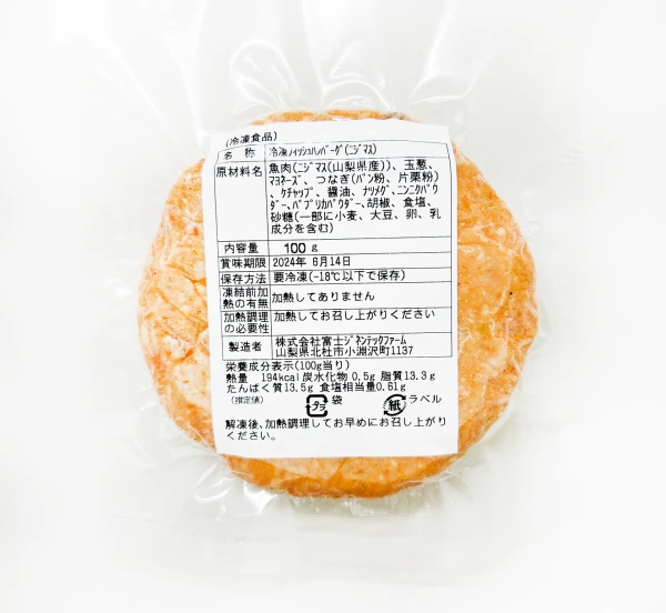 原材料名:魚肉(ニジマス(山梨県産・養殖))、玉葱、マヨネーズ、つなぎ(パン粉、片栗粉)、ケチャップ、醤油、ナツメグ、ニンニクパウダー、パプリカパウダー、胡椒、食塩、砂糖(一部に小麦、大豆、卵、乳成分を含む)