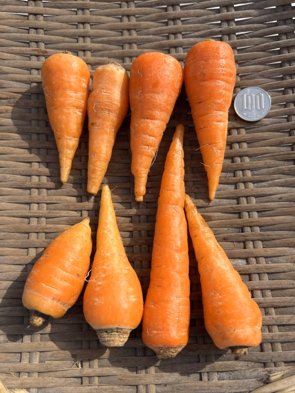 品種は、新黒田五寸、恋夏、アロマレッドという品種になります。青森の気候では、秋冬時期の収穫に適したにんじんです。そのにんじんを、農薬、化学肥料を使わず、MOA自然農法のガイドラインに基づき、育てました。品種は混合になります。