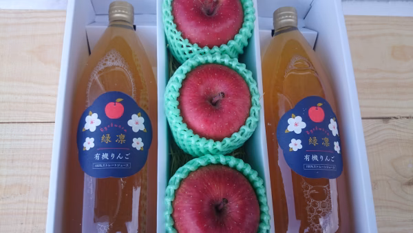 当農園のオーガニックりんごのみを使用したジュース(有機JAS認証)と、季節に合わせた品種のりんご(特別栽培)の詰め合わせです。
