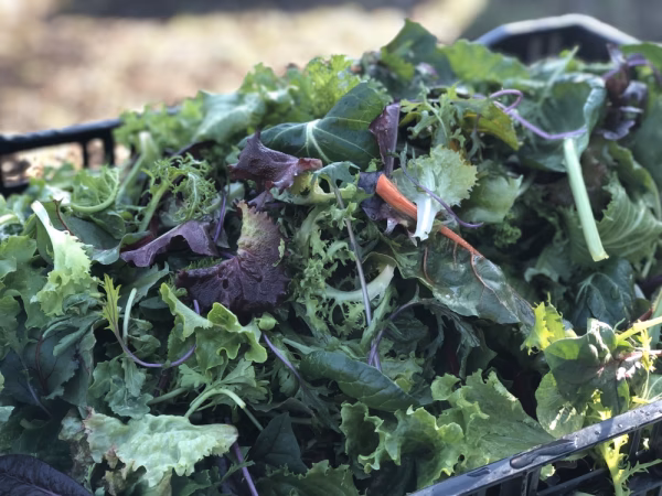今回の気まぐれサラダは、ハウスの中を整理しているときに収穫する必要のあった葉物だけをミックスしています。