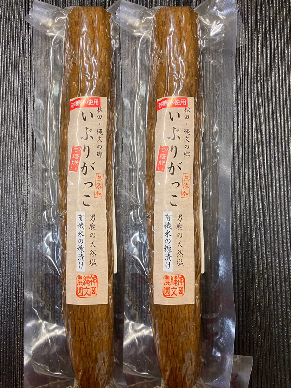 ⭐️お味は⁉️生産者のこだわり⭐️ みなさんが普段食されてるいぶりがっこは、ほとんどお砂糖を使用しています。当農園では砂糖を一切使用せず、農園で作った大根、有機米の米糠、男鹿の天然塩、米黒酢のみでつくりました。 燻った香りももちろんですが、大根本来の味と歯ごたえ、昔ながらの素朴な味を再現しました。 そのままお召し上がりしても十分美味しいですが、お砂糖を使用していないため、他の料理との相性も抜群です。 Lサイズ、一本300g前後[276g~350g]となります。