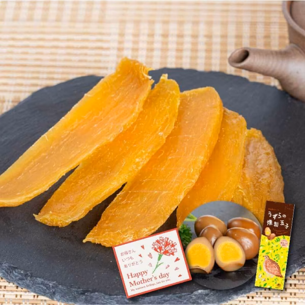 - <干し芋> さつまいも(静岡県産) <うずらの燻製玉子>5個入り燻製玉子原材料 うずら卵水煮(国産)、水あめ、しょうゆ、グラニュー糖、加工黒糖、食塩、調味料(アミノ酸他)、(原材料の一部に小麦、大豆を含む)
