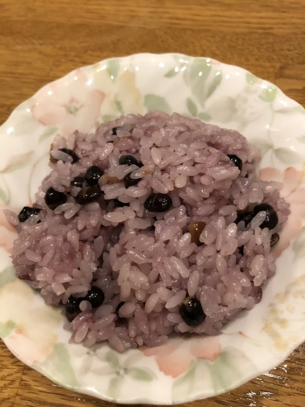 ③少し多めの水加減で、豆と2粒分の梅干しの果肉をちぎって入れて普通に炊きます。