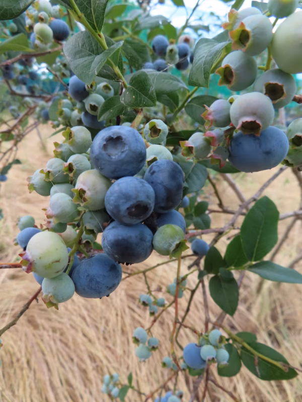 ブルーベリーは収穫後に追熟しません、表面に白い粉(プルーム)が吹いて、触って枝からポロっと採れるのが完熟した美味しさの目印です。