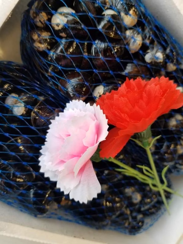お母様の健康と長寿を願って茨城県涸沼川湖産のしじみはいかがでしょうか。母の日用に赤いカーネーションの造花を透明の袋に入れてご用意します。