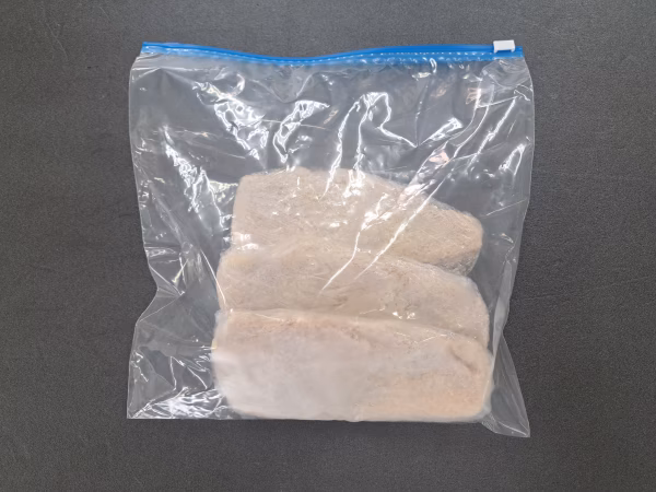 さばいて直ぐにカットしてパン粉を付けてラップで一枚づつ個包装しています。