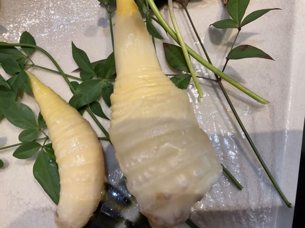 ゆで竹の子。米ぬかで茹でて、あく抜きをしっかりしています。時々ぬかが付着していることもありますが、調理前には再度洗ってください。
