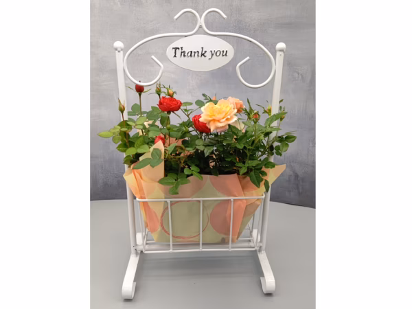 スイングポーチの2鉢入りバージョンです♪バスケットに入ったミニバラがブランコに乗っているようにユラユラとスイングします。白を基調とした可愛さと清廉さを兼ね備えた手持ちバスケットのミニバラになります。