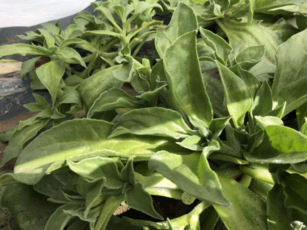 表皮には根から吸い上げた養分を隔離するための細胞(ブラッター細胞)が付き、それが氷のように見えるので、アイスプラントと呼ばれています。肉厚で、ほのかな塩味とぷちぷちした食感が面白いです。