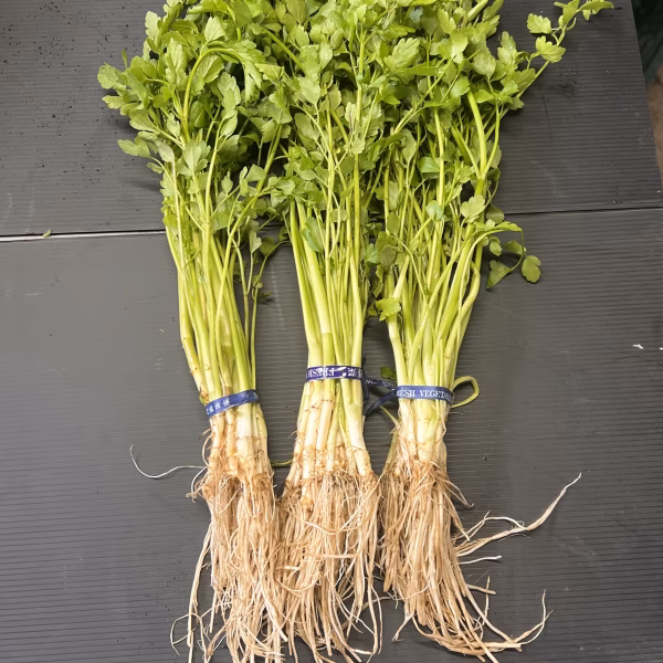 独特の香りと歯触りで親しまれている三関産せりは根こそぎ食べられるのも特徴です。