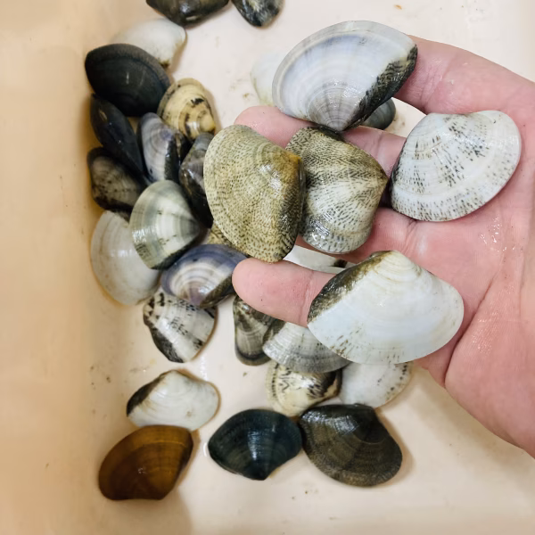 伝統漁の手堀りはまぐりです。一般的には船で取りますが、この時期だけ手堀り漁が解禁になります。手掘りは傷がつきにくく、長持ちするのが特徴です。