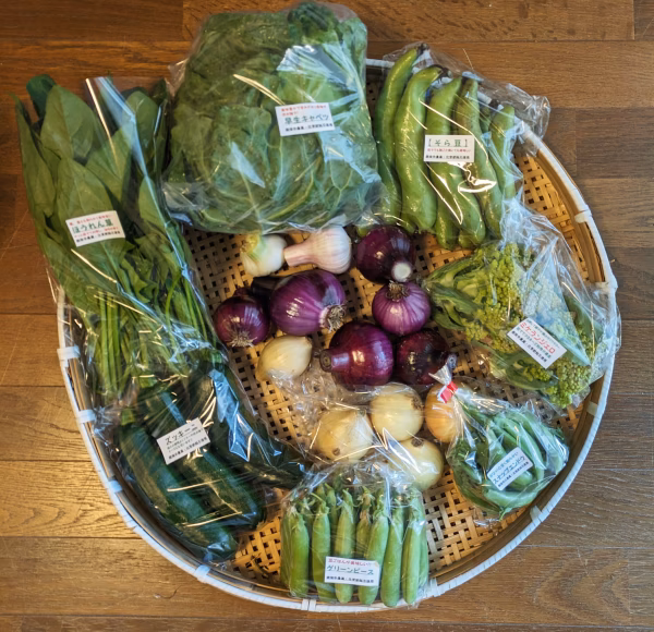 5月に入って収穫を始めた「そら豆」「グリーンピ━ス」「スナップエンドウ」等の豆類メインに「ズッキーニ」「早生キャベツ」「サラダ赤玉ねぎ」「ほうれん草」「にんにく」「イタリアンカリフラワー」等の収穫中の旬のお野菜を7〜8品目集めた野菜セットです。