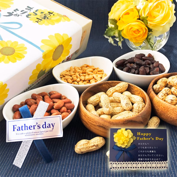 今年の父の日はホンモノをあげてみませんか? お酒のおつまみとしても、おやつやお茶請け、また健康食品としても優秀な千葉県産落花生の贈り物はいかがでしょうか。 さや煎りはもちろん、当店大人気商品のバタピーや素煎り、 甘煮などバラエティに富んだ5種入りギフトセットです。 ご希望到着日のご指定がない場合、6月15日着にて手配させていただきます。 また、6月15日着ご希望の場合は、6月12日中までのご注文をお願いいたします。 それ以降のご注文の場合はお約束ができかねます。 【内容】 ・千葉半立 100g ・Qなっつ 200g ・極細バタピー60g ・素煎り 60g ・甘煮 180g (800gのセットは半立とQなっつのさや煎りがそれぞれ250gに変更になります。) ■賞味期限 4ヶ月   ■保存方法  直射日光・高温多湿を避け、開封後はお早めにお召し上がり下さい。 ■販売者  株式会社ヤマハン  千葉県旭市中谷里8085-8