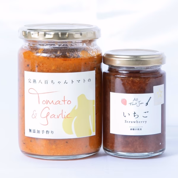 - <本格パスタソース ガーリック> 原材料名:トマト【姫路市産】、ローストオニオン、発酵調味料(米糀、食塩、酵母菌、乳酸菌)ローストガーリックペースト(ローストガーリック、食用なたね油、にんにく、食塩、香辛料)、ワイン、ワインビネガー、食用オリーブ油、食塩、香辛料、バジル 栄養成分表示(100gあたり) エネルギー 87kcal、たんぱく質 1.6g、脂質 3.2g、炭水化物 12.8g、食塩相当量 0.5g ※数値は日本食品標準成分表を用いて計算した推定値です。 <オールフルーツジャム いちご> 原材料名:いちご【姫路市産】、りんご果汁、レモン果汁 栄養成分表示(100gあたり) エネルギー 56.8kcal、たんぱく質 1.1g、脂質 0.2g、炭水化物 14.5g、食塩相当量 0g ※数値は日本食品標準成分表を用いて計算した推定値です。