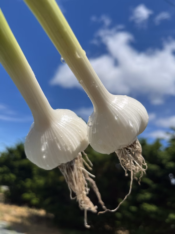 掘りたての「生にんにく」は驚くほどみずみずしく、「生」独特の風味を持っており、加熱すればフルーティーで甘みが強くまろやかで、乾燥にんにくとは違った食感を楽しむことができます。また、生のまますりおろしたりスライスしたりして、刺身などの薬味として用いれば、刺激的な辛味と風味が口中に広がります。