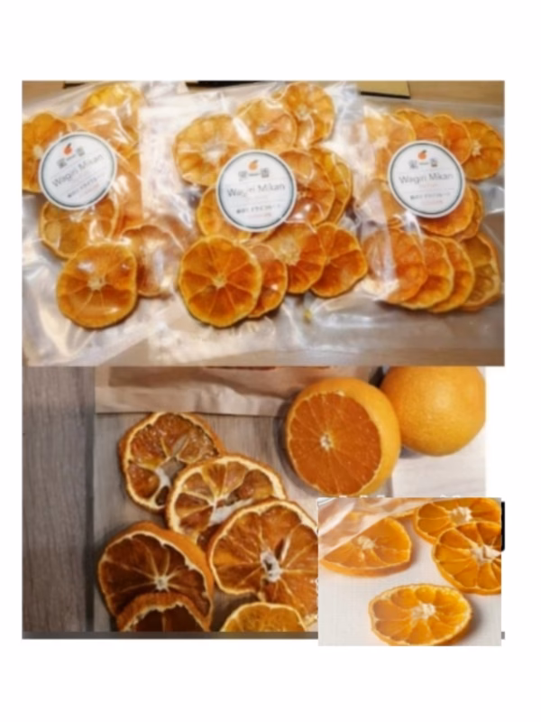 今年まで木に成らして収穫した、越冬早生みかんを輪切りにし、砂糖不使用ですので、そのままをパリパリ食べたり、ヨーグルトや、紅茶に浮かべたり、サラダの演出に、是非お使い下さいませ。