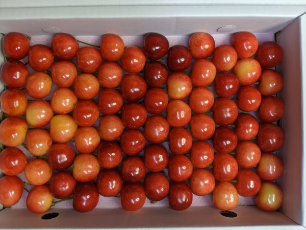 佐藤錦の2Lサイズのみを1段手詰め致しました。 今年は作柄不良のため、2Lサイズは希少価値があります。