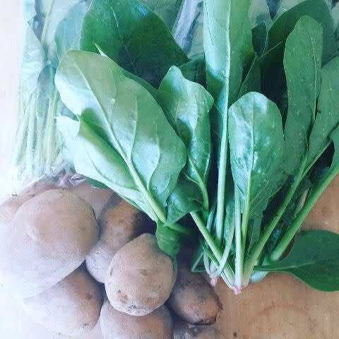 - じゃがいもは冷暗所で保管してください。光が当たると青くなりますので、ご注意ください。ほうれん草は冷蔵庫で保存してください。