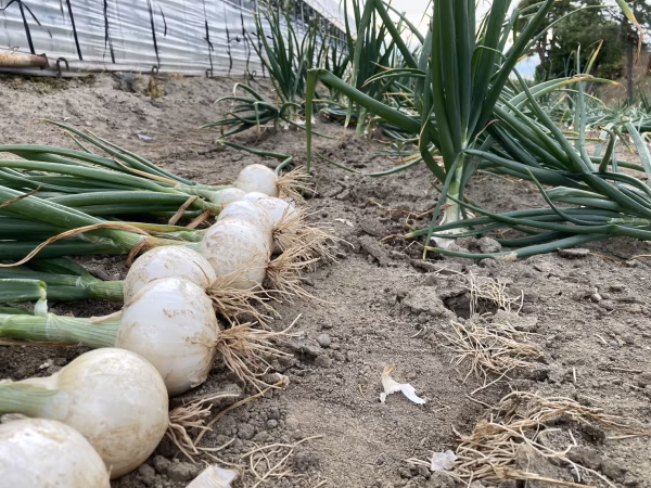 通常の玉ねぎは収穫する前に皮が茶色くなるまでしっかり乾かしてから収穫するのですが、白玉ねぎはみずみずしいまま収穫。水分量が多いので足が速く、収穫後は常温で約1ヶ月くらいが食べごろです。冷蔵庫に入れておくともう少し長持ちします。