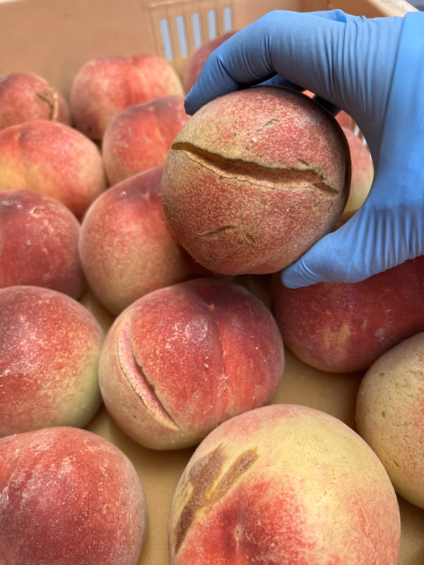 当日の朝収穫した桃をお送りしますが、ここ最近の雨や昨日の大雨で糖度低下はもちろん核割れ桃のタネの中に雨水が入り込んで晴天時より傷みやすい状態です。ぜひ追熟せずにできるだけ早く加工をお願いします。