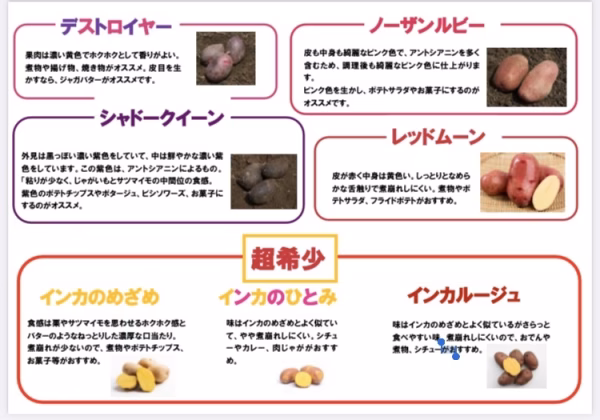 シャドークイーン…果肉が紫色。ポテトチップスやポテトサラダ、お菓子がおすすめ