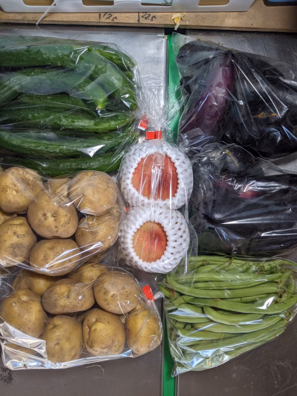 インゲン、キュウリ、長ナス、ジャガイモ、早生桃