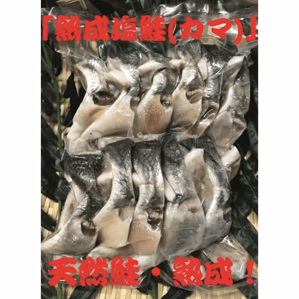 - 商品名:熟成塩鮭カマ 原産地:北海道稚内市宗谷 原材料:鮭、塩 保存方法:冷凍 内容量:1kg 価格:500円+消費税