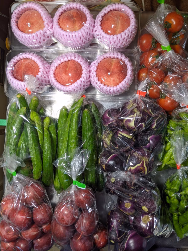 キュウリ1.1kg、丸ナス1kg、シシトウ400g、中玉トマト630g、早生桃900g、スモモ1kgの詰め合わせです。 桃の品種は暁星で小さいサイズです。糖度は14度程度あります。スモモの品種は、ハイウッドです。糖度は11〜14度程度あります。