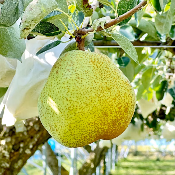 約800メートルの標高・平棚栽培の畑で太陽の光をたっぷりと浴びた西洋梨です。果実に袋をかけ病害虫から守り、安心・安全・高品質にもこだわって生産しています。