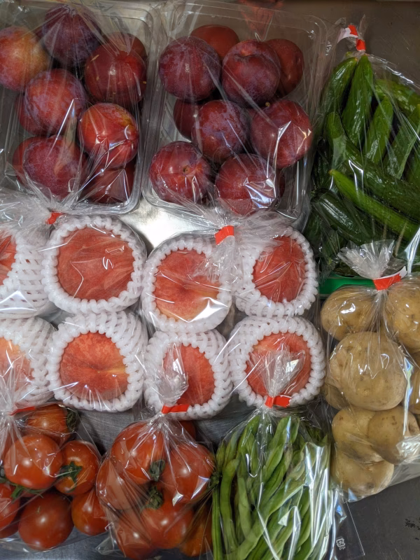 インゲン300g、キュウリ550g、ジャガイモ900g、トマト600g、スモモ1500g、桃1000gの詰め合わせです。 複数出品のため、それぞれの重さは平均です。