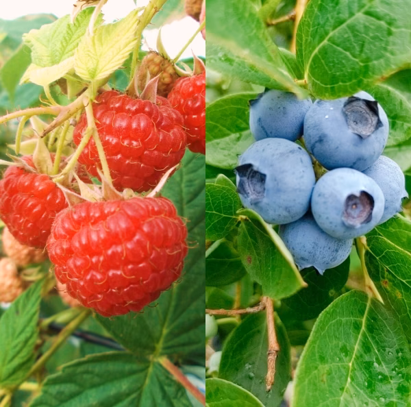 栽培期間中、化学農薬、除草剤不使用、有機肥料で育てた北海道十勝産ラズベリーとブルーベリーのセットです。