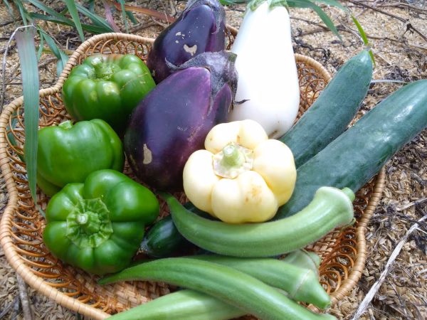 ホタルが棲む里山の豊かな自然、山の湧き水で育てました 農薬・除草剤・化学肥料は完全不使用 露地栽培で雨、風、太陽光などを受け、里山の自然の中でたくましく育った 野菜たちは、それぞれの野菜本来の生命力にあふれた濃い味がします。 また、しっかりとした歯ごたえがあるのが特徴です。 ●お客様の声● ・野菜の味が濃く、少量でも満足感がある ・野菜特有のいろんな味がしっかりとする ・シンプルな調理で済むから料理がラク ・おいしくて食欲がでてくる など嬉しいご感想をいただきました!! ●野菜セットの内容 オススメの食べ方や料理● ・とろーり旨ナス(白いナス)  →加熱で中がトロリとします。てんぷら・揚げびたしなど ・泉州水ナス(紫ナス)  →浅漬け ぬか漬けに ・きゅうり 生のまま味噌マヨにつけて・浅漬け ・オクラ オクラ納豆・トッピング ・パプリカ(緑/白/赤)   →軽く炒めシャキシャキ食感。炒め・パエリア・ピクルス ・アイコ(ミニトマト) 赤/オレンジ  →生のまま・サラダ・スープにも ・平戸にんにく(バラ)  →ガツンとした香り 皮ごと丸揚げ・餃子・チャーハン  ★詳細な情報は「平戸ニンニクの商品ページ」をぜひご覧ください! ●栽培、生産方法・こだわり● ・農薬・除草剤・消毒剤・化学肥料を一切使用しておりません。 防除柵や網の設置をし、こまめな草刈り、虫除去などを行い全て手作業で 管理しています。 ・平飼いの養鶏場、米農家と契約し、発酵鶏糞や米ぬかを用いた自作のオリジナルブレンドの肥料を使用しています。 ▼数量、分量の目安 ・2Kg(60サイズ)   個数の目安は画像をご確認ください(写真は2kg) ※その日採れた野菜をセットにするため写真と各野菜の数や色が異なる場合があります。 ●注文に際しての注意点● ・農薬・除草剤・消毒剤・化学肥料は一切不使用で、さらに露地栽培のためキズ、変色、形がいびつな野菜も含まれます。そのため訳あり価格での販売をいたします。 ・鮮度を保つことを優先し、洗浄せずすぐに出荷しますので、土がついている場合がありますが、よく洗ってご調理ください。 ・上記の理由でちいさい虫が入っていた場合は、そっと取り除き、洗浄してください ・里山で耕作放棄地を開拓しながらほぼ一人で農作業をしており、他の農産物との兼ね合いもあるため到着日の指定はできませんが、新鮮なものを出荷いたします。数量に限りがあります。 ・また、検品、梱包、出荷まで万全にチェックしていますが、万が一商品に関して、不備や配送時のトラブルがあった際は、ポケマルの購入履歴の「注文について生産者に問い合わせる」より、不良品の写真、どの様な状態であったのか、詳細をお知らせください。出来る限り速くご対応いたします。