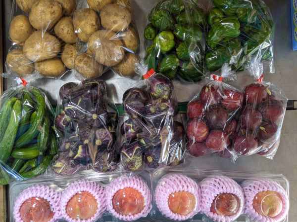 キュウリ600g、ジャガイモ1800g、丸ナス1200g、ピーマン550g、スモモ1kg、桃1kgの詰め合わせです。