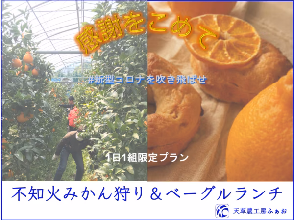 当園通常価格は、不知火みかん狩り1,300円、ベーグルランチ(ふぁくとりーNolley)1,400円で、合計お一人2,700円ですが、最大26%offでご提供いたします。