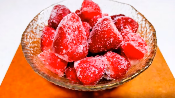 完熟イチゴをヘタを取って水道水を掛け流し後に冷凍しています。