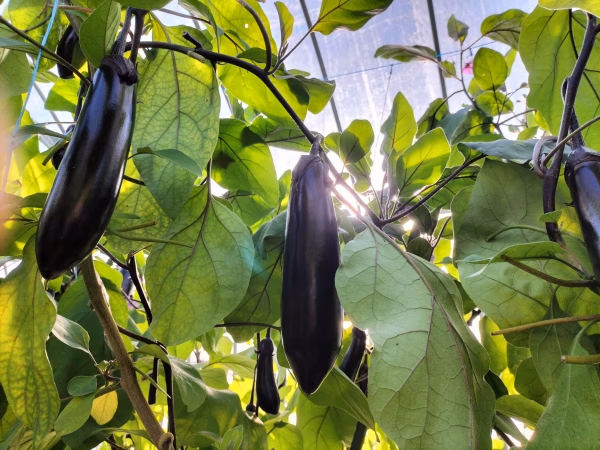 #当園のナスについて:黒光りしていて太くて長いです。
