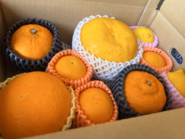 〇ご挨拶 こんにちは!まつさか農園です。 私達は和歌山県の有田地方で温州みかんの栽培をしているみかん農家です。 草生栽培という草をあえて生やしっぱなしにする栽培技術を使って優しくて香り高いみかんを作っています。 祖母の豊子お婆ちゃんが50年間ず~っと草のお守りをしてくれたお陰で土はとってもフカフカです。 これからは孫の進也が新しい技術を取り入れながら「まつさか農園らしいみかん」を作り続けていきたいと思っています。 〇夏の柑橘ギフトセットって? 冬のフルーツである柑橘が「なぜ夏・・・?」って思いますよね。 柑橘は追熟できる果物であるということはマニアックな方はご存じかと思います。追熟すると味に深みが出てフレッシュなモノとはまた違う美味しさが味わえます。 その美味しさをなんとか届けられないかと考え、冷蔵追熟を長い間勉強していました。 1.不知火     3月収穫 約5ヶ月追熟 2.完熟甘夏    5月収穫 約3ヶ月追熟 3.バレンシア   6月収穫 約2ヶ月追熟 4.リスボンレモン 2月収穫 約6ヶ月追熟 を固定としながら 5.完熟清見    4月収穫 約4ヶ月追熟 6.ブラッドオレンジ2月収穫 約6ヶ月追熟 のどちらか1種、合計5種類の柑橘を詰め合わせします。 フレッシュな柑橘とはまた一味違う食感や味わいを感じて頂ければと思っています。 箱の中には ・品種の説明チラシ ・まつさか農園通信 を同梱しております。それぞれの柑橘の食べ方や、どれがどの柑橘かが分かる形になっておりますのでご安心下さい。 〇テスト販売・・・? 冷蔵追熟はリスクも伴います。それは貯蔵障害です。 水気がなくなってしまうスアガリ、異味異臭を感じさせるアミノ酸の果実内での生成、そしてもちろん腐敗です。 ここ何年か自分で味見をしたり身内に発送してみたりの試験を繰り返し、大丈夫そうだとはいう感覚はあるのですが、何分不慣れなため少し怖いのが正直なところです。 ですので今回は上記のリスクがあることを理解して下さる方に購入をお願い出来ればと思っております。 大変勝手なお願いであることは自覚しています。 もしも貯蔵障害があった場合はご報告頂ければ商品の一部送り直しをさせて頂こうと思っております。 また価格も本来予定している価格から20%ほど値引きした価格でご提供させて頂きます。 1.5kg 3250円(税込)→2600円 2.5kg 5000円(税込)→4000円 色々と面倒なお願いをしてしまっていますが、もしご協力いただける方がいらっしゃったら宜しくお願い致します。 〇贈答用にお使いの場合 たぶん大丈夫かと思うのですが、一応お届け先には上記の事を予めお伝え頂ければとても助かります・・・。