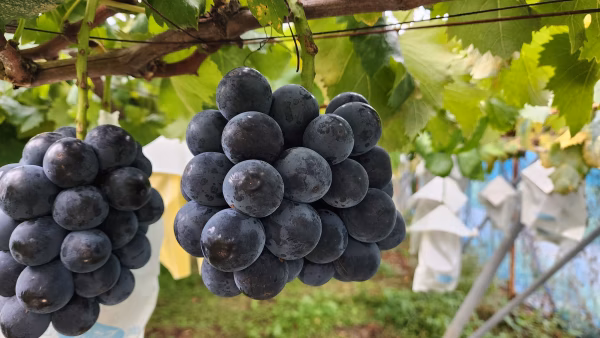 外観は巨峰に似ていますが、粒はより大きく、真っ黒で迫力があります。