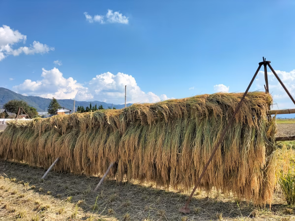 無肥料、農薬不使用の自然栽培です。昔ながらのハザがけ天日乾燥しています