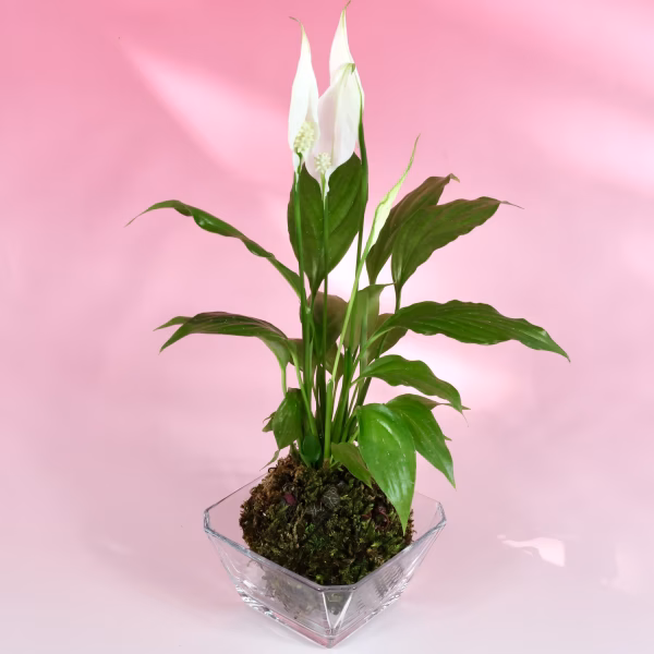 色白美人なスパティフィラムと高野山麓で採取しまし這苔を使った苔玉です。
