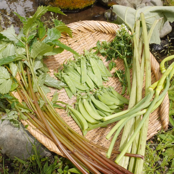 絹さや、スナップエンドウ、赤ミズ、ふき、花クレソン、ラディッシュ、サニーレタス、サラダ菜、ネギ