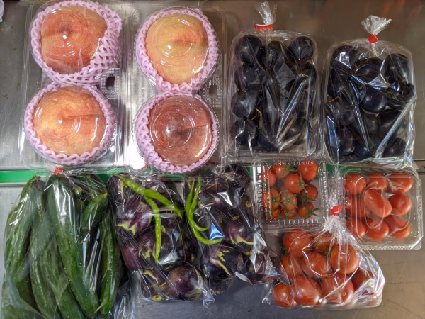 キュウリ1kg、トマト700g、ナス800g、スモモ1.1kg、桃1.6kgの詰め合わせです。