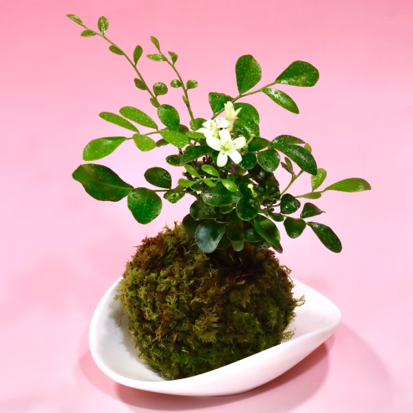 常緑低木ミカン科の「月橘」と高野山麓で採取した天然這苔を使った苔玉です。