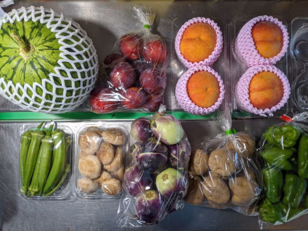 オクラ200g、シイタケ100g、ジャガイモ1kg、スイカ3.2kg、ナス890g、ピーマン500g、桃1.1kg、スモモ800gの詰め合わせです。