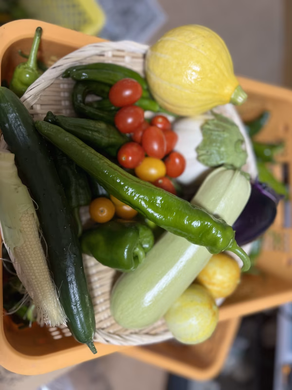 当農園で旬のお野菜数種類(時期によって変動)をセットしたものをお届けします。野菜セット内容はこちらにおまかせとなりますが,絶対にこれを入れて!という希望があればご相談ください。最低5種類〜8〜10品種ほどお入れします。