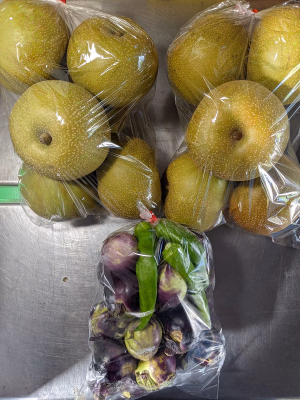 丸ナス約900gと梨4約kgです。ナスの品種は薄皮丸ナスです。漬物や煮浸しにおすすめです。梨の品種は幸水です。大玉サイズ6個入り✕2袋です。